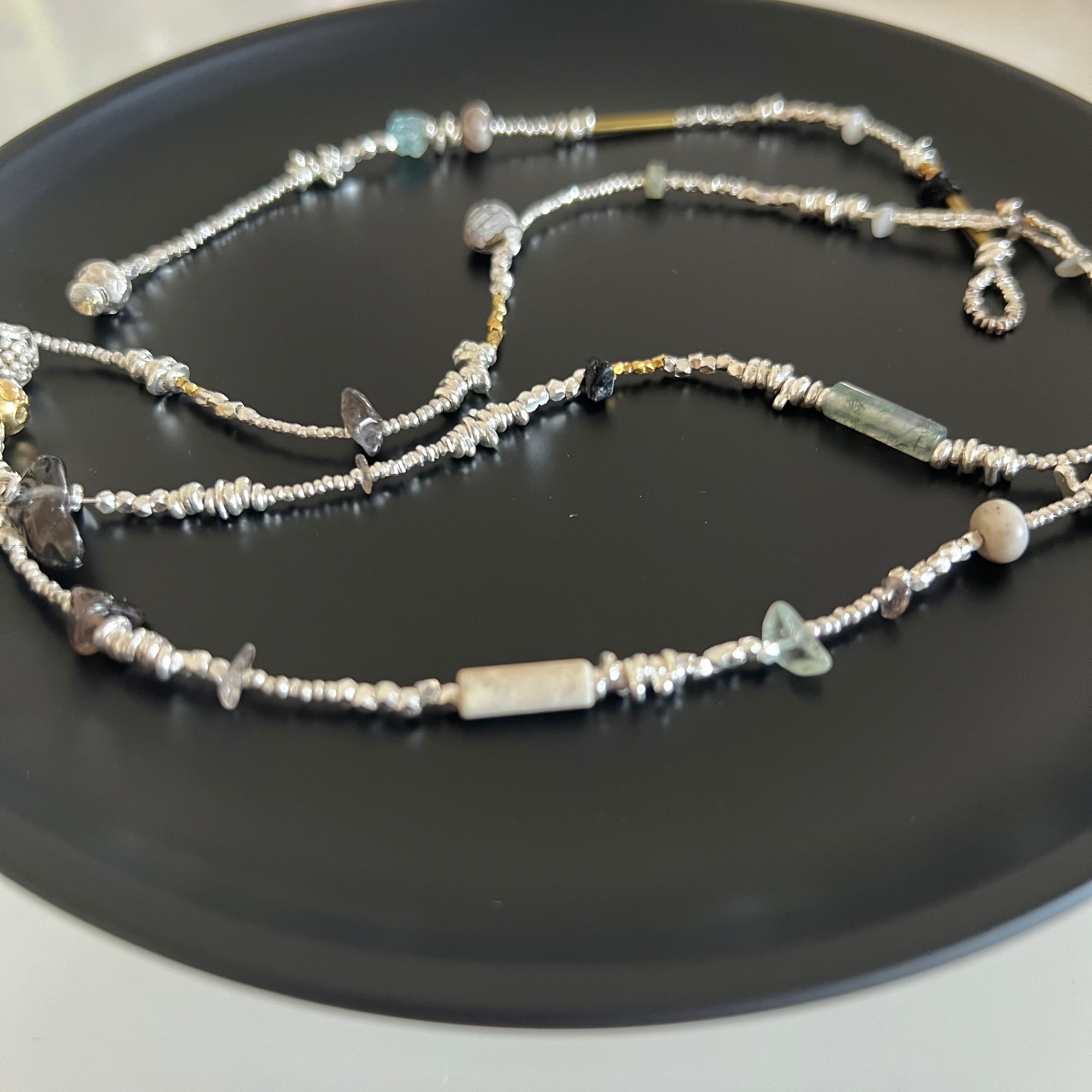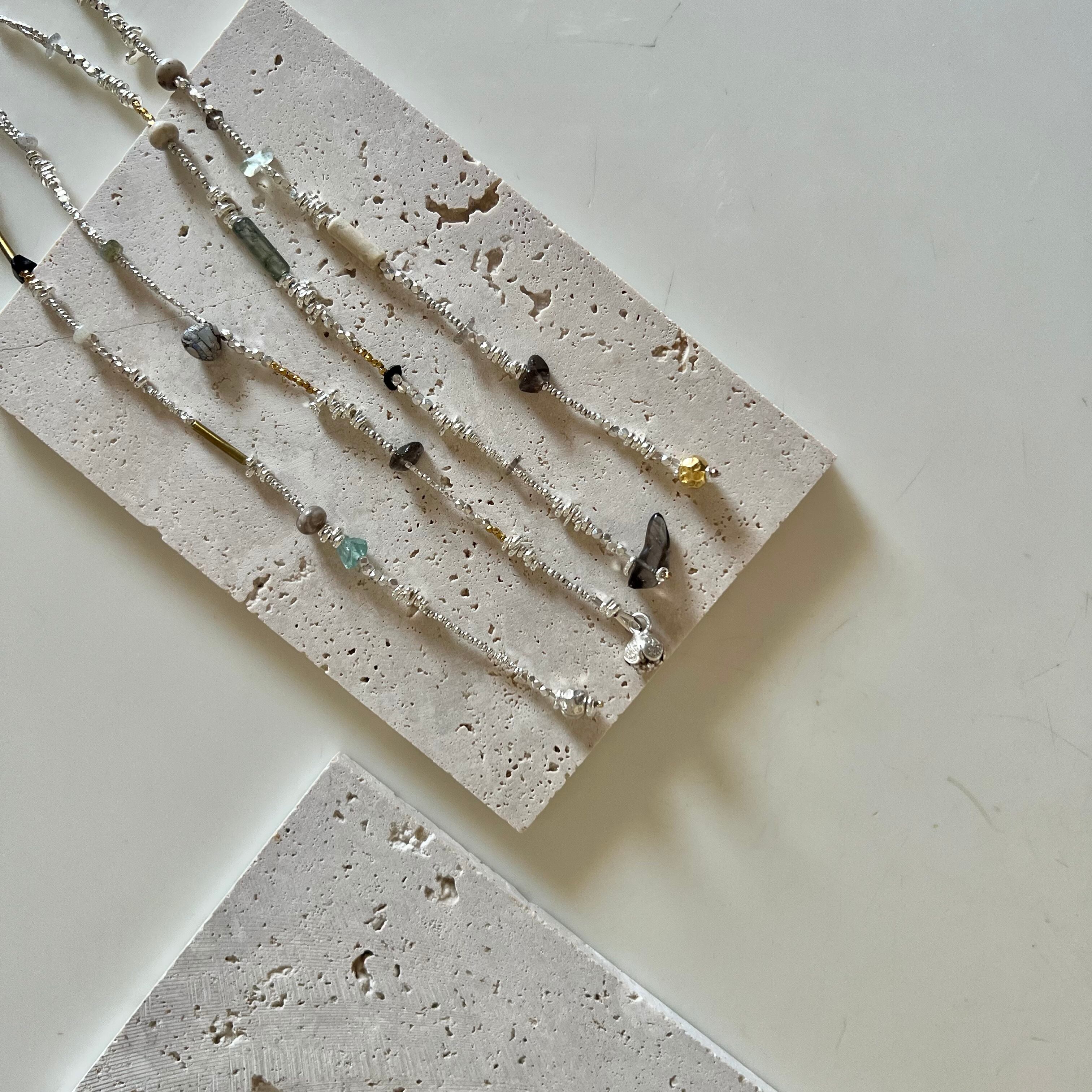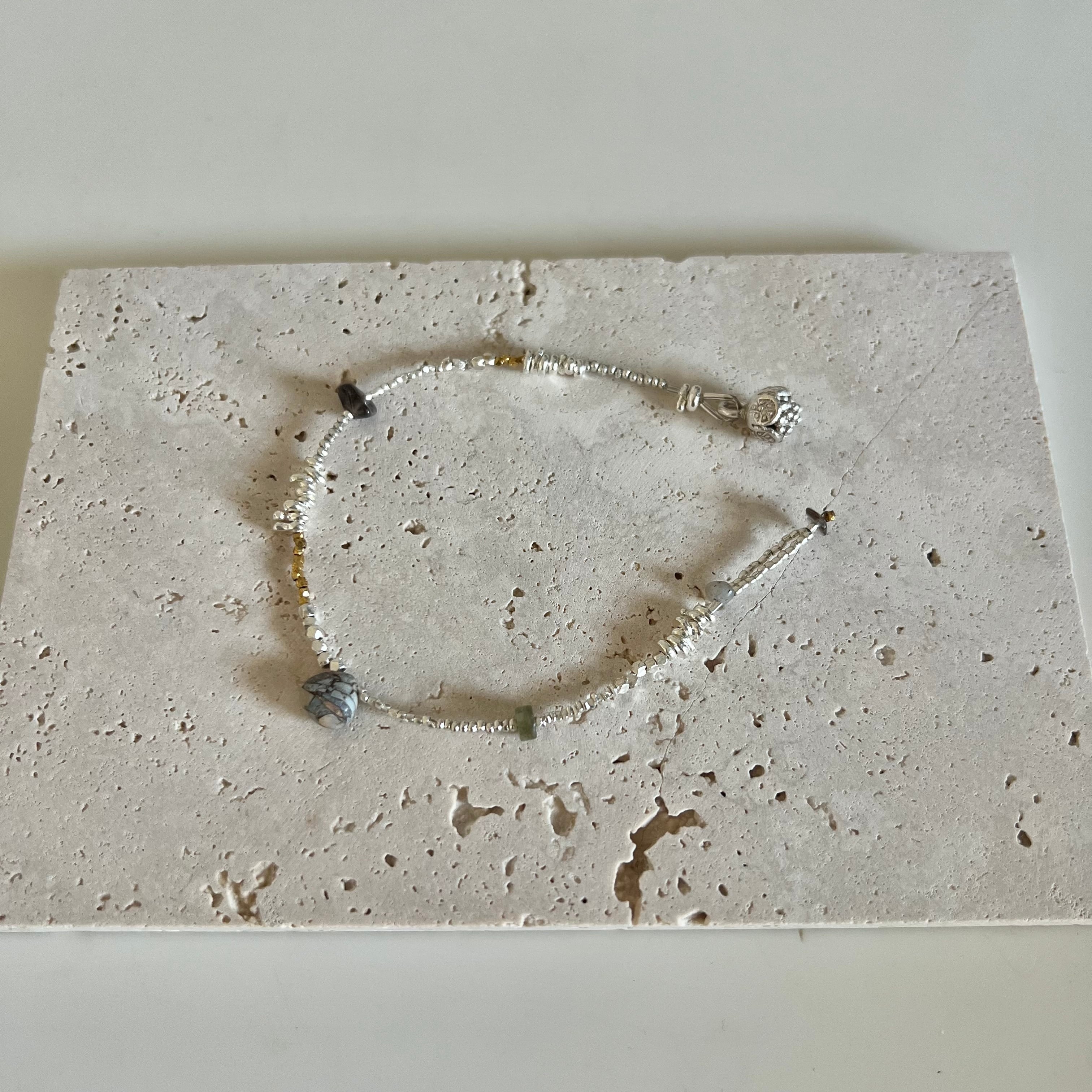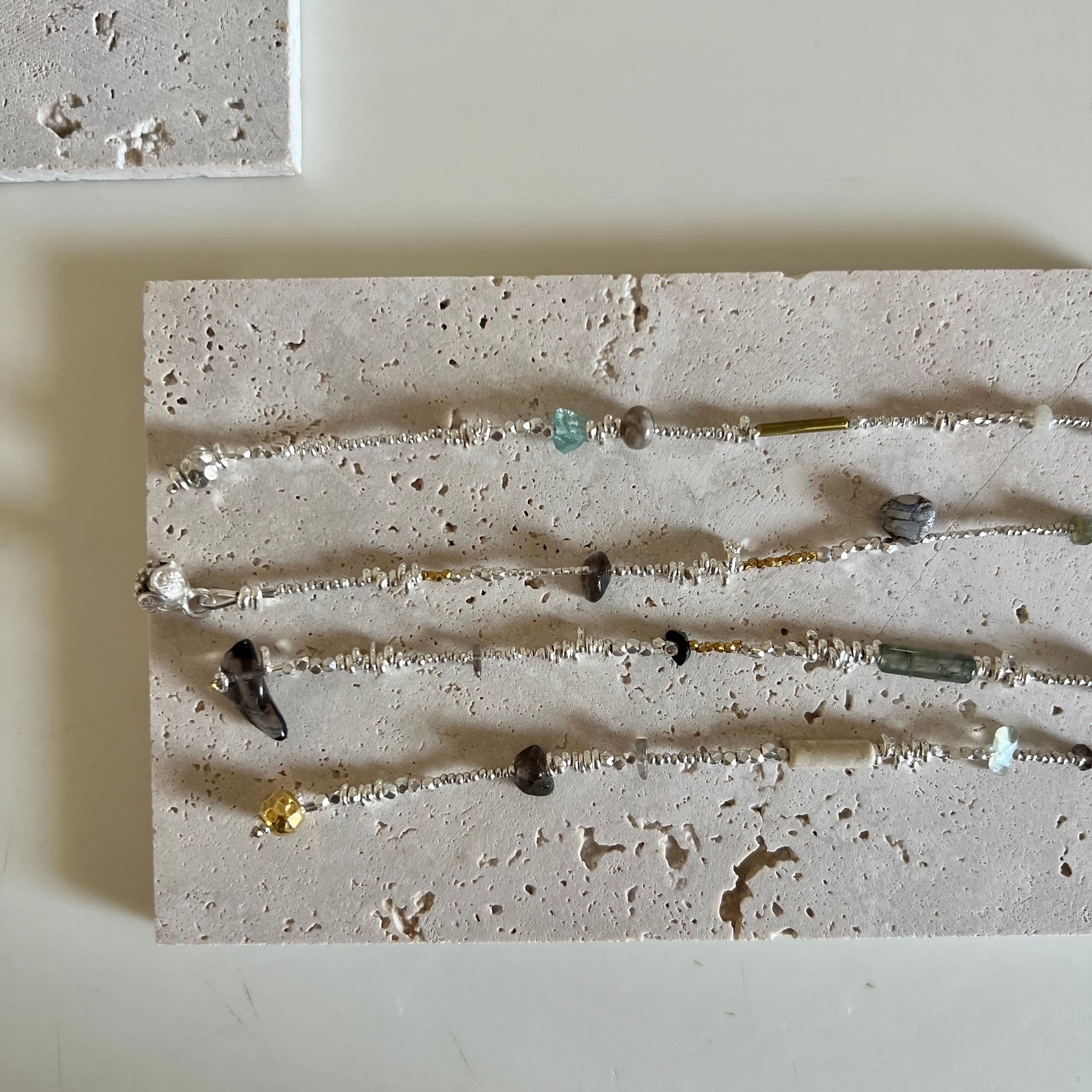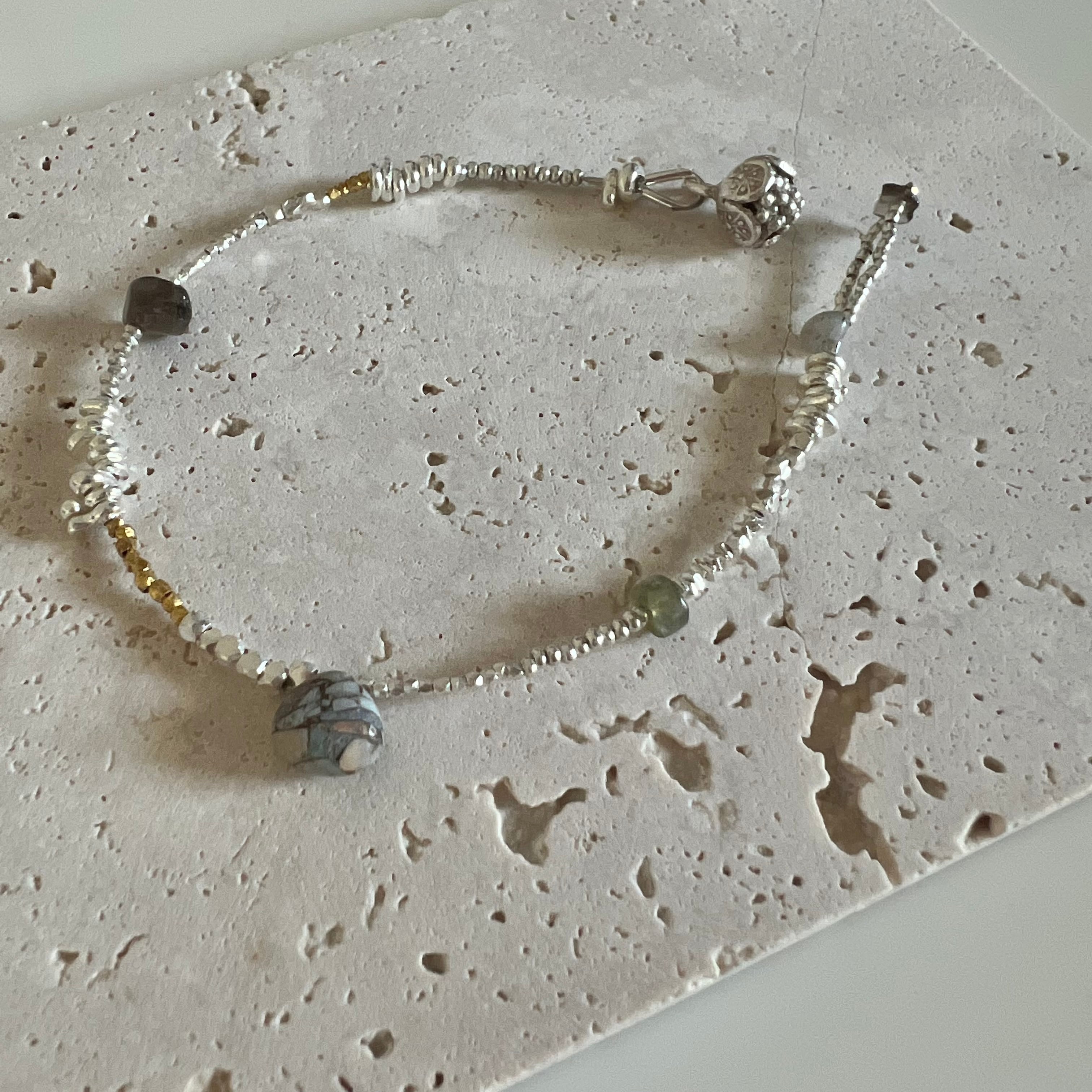 さまざまな形のカレンシルバービーズや天然石を組み合わせたブレスレットです。