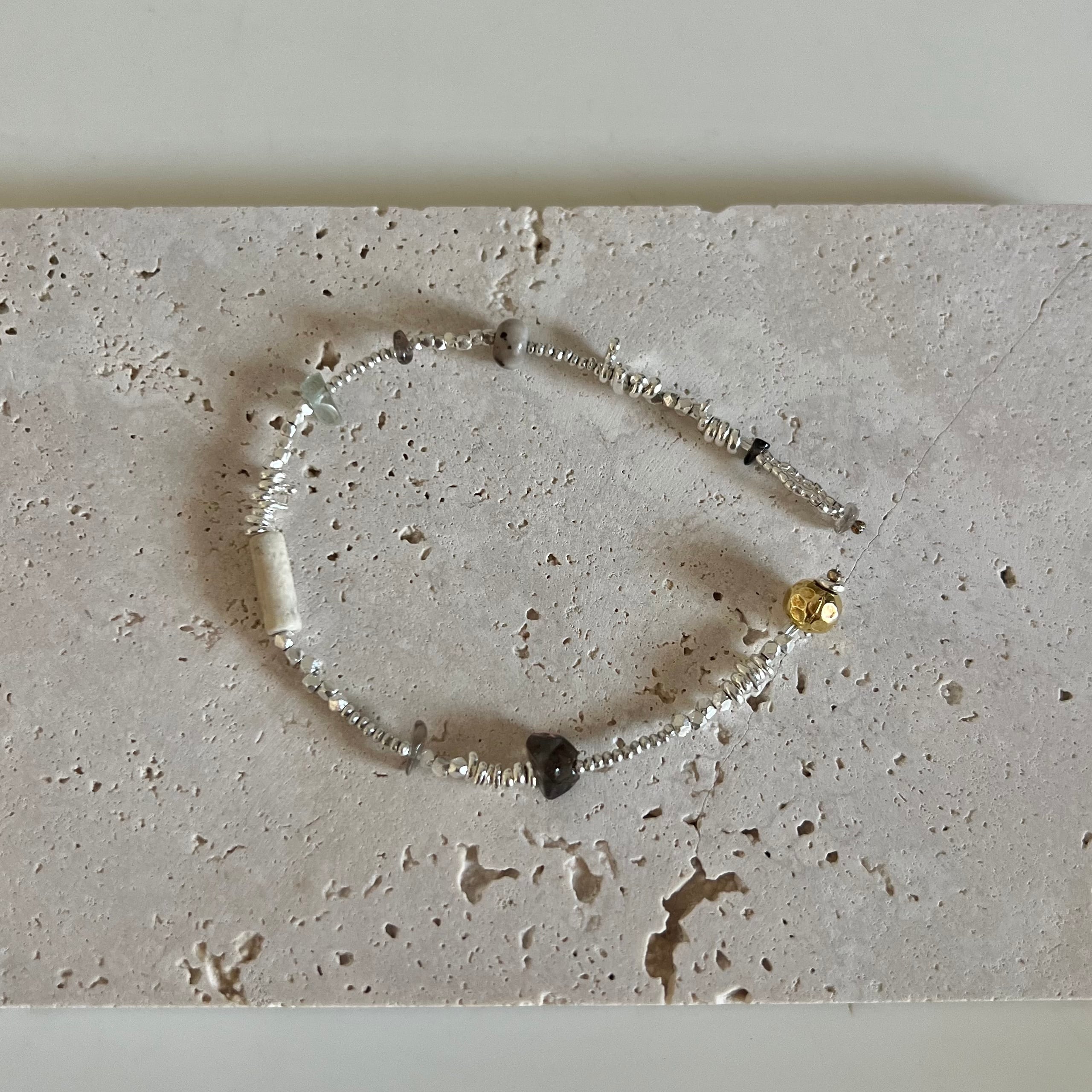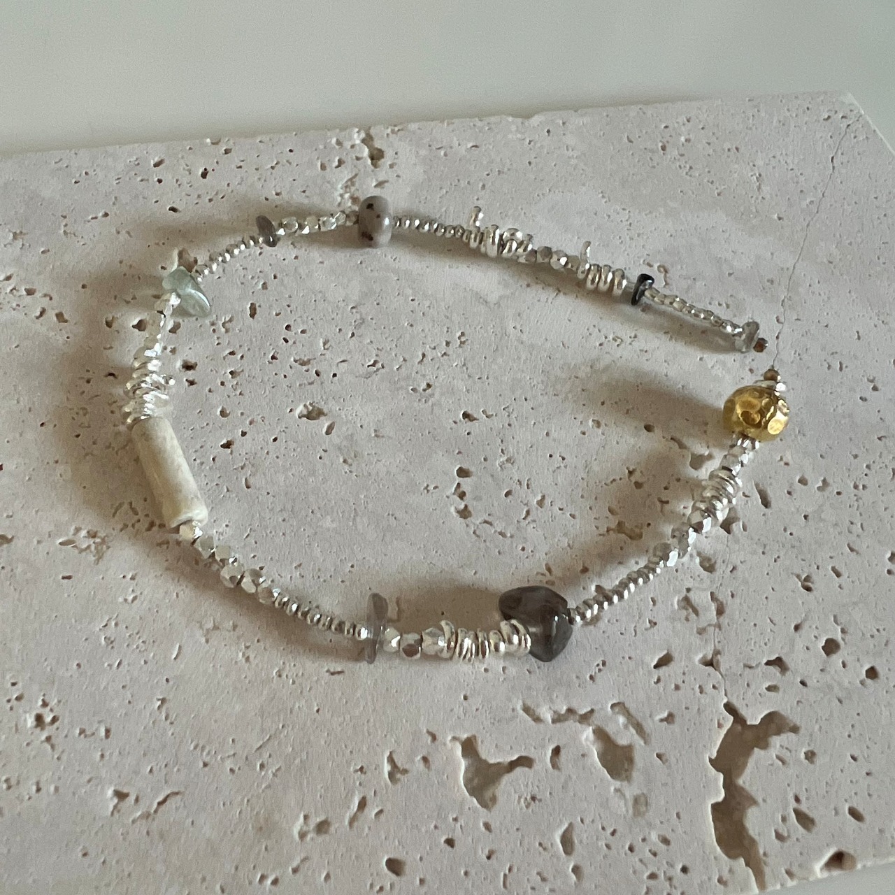 さまざまな形のカレンシルバービーズや天然石を組み合わせたブレスレットです。